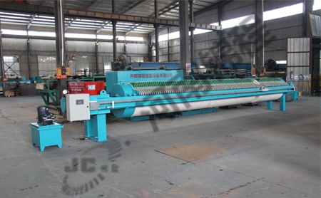 圓形壓濾機的構成部分主要有機架,止推板,壓緊板,大梁,濾布,濾框等